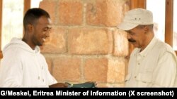 ቢንያን ግርማይ ምስ ፕረዚደንት ኢሳያስ ኣፈወርቂ ኣብ ኣስመራ ኣብ ዝተራኸበሉ ነቲ ታሪኻዊ ዓወት ብምጉንጻፉ ዝተሸለሞ ቀጠልያ ማልያ ንፕረዚደንት ኢሳያስ ኣፈወርቂ ኣበርኪቱ።